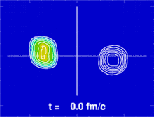 Résultat d'un calcul avec l'équation de Boltzmann quantique d'une réaction de fusion de noyaux lourds (Sn+Xe à 10 MeV/u). Les courbes de niveau représentent la densité nucléaire projetée sur le plan de réaction (cadre 80 x 60 fermis) en niveaux de couleur pour le noyau projectile pour illustrer les échanges de nucléons. L'échelle des temps est le fm/c, temps de parcours de la lumière pour 1 fm. :