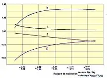 - Il est également possible de définir la concentration relative en hydrogène par rapport à la matière fissile par le rapport , cependant les deux grandeurs et ne sont pas indépendantes avec . Une augmentation de l'enrichissement se traduit, toutes choses égales, par une diminution du rapport . Ceci conduit à préférer le paramètre pour paramétrer la modération du cœur