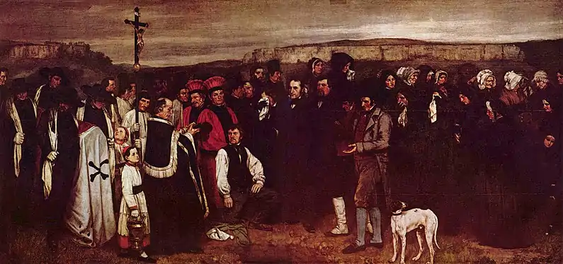 Influencé entre autres par Delacroix, Géricault et Constable, se liant d'amitié avec Baudelaire, engagé politiquement car marqué par la révolution de 1848, le peintre Gustave Courbet introduit une rupture radicale : il emploie le terme « réalisme » pour désigner sa propre peinture en 1855[N 1], en marge de l'exposition universelle de Paris[4]. Cette exposition dissidente qu'il intitule « Le Réalisme, par Gustave Courbet », constitue un manifeste et déclenche une vive polémique dans les journaux. Maxime du Camp écrit que « Courbet peint des tableaux comme on cire des bottes », et Étienne-Jean Delécluze enfonce le clou en affirmant que « le réalisme est un système de peinture sauvage où l'art est avili et dégradé »[2]. Courbet, qui se méfie des étiquettes, définit lui-même en 1861 ce qu'il entendait par là : « Le fond du réalisme c'est la négation de l'idéal ». Entre-temps, les partisans, face aux opposants, se sont organisés. En 1856, paraît à Paris un périodique intitulé Réalisme, fondé par Louis Edmond Duranty avec le soutien de Champfleury, destiné à défendre l'esthétique nouvelle dans l'art et dans la littérature[2], et l'année suivante, l'écrivain Gustave Flaubert est victime d'un procès visant Madame Bovary, jugé, en certains passages, trop réaliste et donc censuré.
