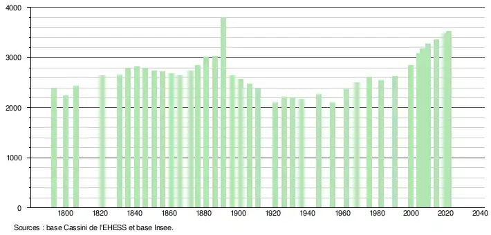 | L'évolution du nombre d'habitants est connue à travers les recensements de la population effectués dans la commune depuis 1793. Pour les communes de moins de 10 000 habitants, une enquête de recensement portant sur toute la population est réalisée tous les cinq ans, les populations légales des années intermédiaires étant quant à elles estimées par interpolation ou extrapolation[33]. Pour la commune, le premier recensement exhaustif entrant dans le cadre du nouveau dispositif a été réalisé en 2004[34]. En 2021, la commune comptait 3 529 habitants[Note 5], en augmentation de 4,44 % par rapport à 2015 (Tarn : +1,82 %, France hors Mayotte : +1,84 %). |