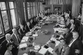 - 1986: les présidents de grandes entreprises européennes, japonaises et américaines réunis à Caux, dont Ryuzaburo Kaku (Canon) et Frits Philips (Philips), lancent la Table Ronde de Caux, pour éviter que les frictions commerciales ne dégénèrent en affrontements internationaux[82].