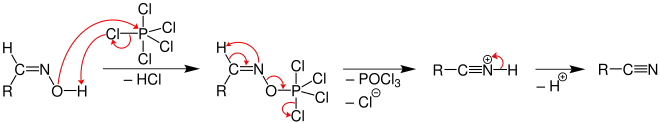La formation d'un nitrile RCN par « déshydratation » d'une aldoxime R(CNOH)H, par exemple sous l'effet du pentachlorure de phosphore PCl5, se déroule selon un mécanisme analogue :