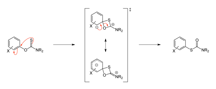 Le réarrangement de Newman-Kwart suit un mécanisme intramoléculaire ; il se passe via un état de transition présentant un cycle à quatre atomes[3],[8] :