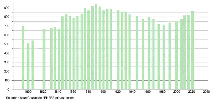 L'évolution du nombre d'habitants est connue à travers les recensements de la population effectués dans la commune depuis 1793. Pour les communes de moins de 10 000 habitants, une enquête de recensement portant sur toute la population est réalisée tous les cinq ans, les populations légales des années intermédiaires étant quant à elles estimées par interpolation ou extrapolation[25]. Pour la commune, le premier recensement exhaustif entrant dans le cadre du nouveau dispositif a été réalisé en 2005[26].