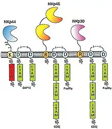 Les récepteurs naturels cytotoxiques (Natural cytotoxicity receptor ou NCR) ont été initialement identifiés à la fin des années 1990[1],[2],[3]. La famille des récepteurs naturels de cytotoxicité comprend trois récepteurs transmembranaires (TM) de type I, appelés NKp46, NKp44 et NKp30, qui sont codés respectivement par les gènes NCR1, NCR2 et NCR3..