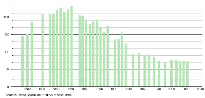 L'évolution du nombre d'habitants est connue à travers les recensements de la population effectués dans la commune depuis 1793. Pour les communes de moins de 10 000 habitants, une enquête de recensement portant sur toute la population est réalisée tous les cinq ans, les populations légales des années intermédiaires étant quant à elles estimées par interpolation ou extrapolation[16]. Pour la commune, le premier recensement exhaustif entrant dans le cadre du nouveau dispositif a été réalisé en 2006[17].