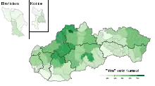 Les taux de participation les plus élevés sont enregistrés dans les régions de Trenčín (36,07 %) et de Žilina (33,68 %), tandis que la région de Bratislava connait le plus bas, avec 21,31 % des inscrits ayant voté[28].