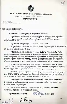 La RSSA de Crimée en tant que sujet de l'URSS est rétablie le par le Soviet suprême de la RSS d'Ukraine à la suite du « oui » massif (94,3 %) des exprimés marqué par une participation de 81,37 %.