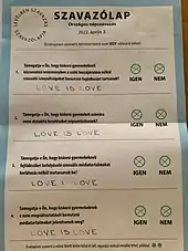 Le 9 novembre 2021, l'Assemblée nationale vote à une large majorité l'organisation d'un référendum sur ces questions. Après le rejet à l'unanimité par la Cour constitutionnelle hongroise d'un recours déposé par l'opposition, le Président de la République János Áder décide le 11 janvier 2022 de fixer le scrutin au suivant, en même temps que les élections législatives[8].