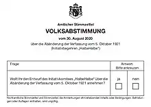 Le , le Landtag fixe la date du référendum au suivant, celui ci ne comportant alors que les deux premières questions[20]. La pandémie de Covid-19 qui touche alors le pays entraine cependant le report du scrutin le à une date indéterminée, avant que le parlement ne décide finalement le de l'organiser le dernier dimanche d'aout[8],[12]. Le , le Landtag décide de fixer le même jour la mise au vote populaire de la troisième question[18],[21].