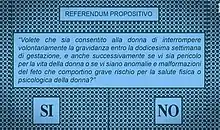 « Volete che sia consentito alla donna di interrompere volontariamente la gravidanza entro la dodicesima settimana di gestazione, e anche successivamente se vi sia pericolo per la vita della donna o se vi siano anomalie e malformazioni del feto che comportino grave rischio per la salute fisica o psicologica della donna? »