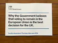 Une brochure présentant la position du gouvernement a été distribuée afin de détailler l'argumentaire du maintien. Cela a été critiqué comme un avantage injuste pour la campagne du maintien et du gaspillage d'argent public[50].