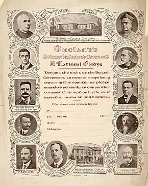 Le 18 avril 1918, le gouvernement britannique, en manque de combattants sur le front de la Première Guerre mondiale, décide d'étendre à l'Irlande la conscription déjà obligatoire dans le reste de la Grande-Bretagne. Il s'attire ainsi l'opposition des nationalistes irlandais et de l'Église catholique. Le même jour, le Lord-maire de Dublin, Laurence O'Neill, rassemble un Comité anti-conscription constitué de Éamon de Valera (futur Président de l'Irlande) et Arthur Griffith, représentants du Sin Féin, William O'Brien et Timothy Michael Healy du Parti parlementaire irlandais, Michael Egan, Thomas Johnson et William O'Brien (homonyme du précédemment nommé) du Congrès des syndicats irlandais (Trade Union Congress - TUC) et du Parti travailliste[4]. Les évêques catholiques déclarent que le décret est une loi oppressive et injuste. Le comité et l'épiscopat font afficher dans les églises le texte de l'engagement suivant qui est signé par des dizaines de milliers d’Irlandais :