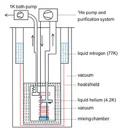 Un réfrigérateur à dilution 3He/4He est une catégorie de cryoréfrigérateur qui fournit un refroidissement continu aux températures cryogéniques aussi basses que 2 mK, sans pièces mobiles dans la région à basse température[1]. La puissance frigorifique est fournie par la chaleur de mélange des deux phases liquides riches en hélium 3 et en hélium 4, respectivement. C'est la seule méthode de réfrigération continue pour atteindre des températures au-dessous de 0,3 K[2].