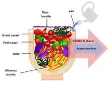 Un pot en terre cuite poreuse, canari en Afrique de l'Ouest et centrale, garni de sable humide, contient un pot intérieur dans lequel l'aliment est placé ; si le pot intérieur est hermétique, il peut contenir des liquides[10] : l'évaporation du liquide extrait la chaleur de la cuve intérieure transférant son enthalpie de vaporisation à l'air ambiant. L'appareil peut être utilisé pour refroidir des substances telles que l'eau, les aliments ou les médicaments sensibles aux hautes températures.