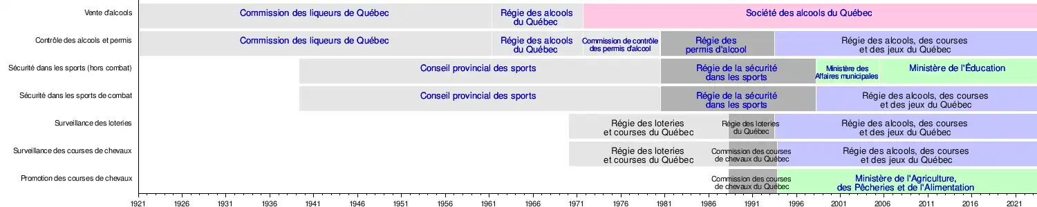 La Régie des alcools, des courses et des jeux du Québec (RACJ) est un organisme du gouvernement du Québec sous la responsabilité parlementaire du ministre de la Sécurité publique, a la responsabilité, en tout ou en partie, de l’encadrement, de la surveillance et du contrôle des activités des secteurs suivants, et ce, dans le but d’assurer la sécurité, la tranquillité et l’intérêt publics :