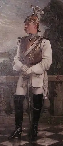 Jusqu'en 1912, un rollerball blanc et un pantalon de botte blanc sont également portés sur le terrain. Les officiers sont avec des épaulettes, des sous-officiers et des hommes enrôlés avec des épaulettes équipées. Il y a aussi des bottes de cuirassier noires (appelées bottes de canon) et le casque de cuirassier en tombak avec des insignes en maillechort et une cartouchière blanche avec une cartouche noire. Lors des défilés, une cuirasse en métal blanc en deux parties est également mise. L'étoile de la garde est sur le devant du casque. (Les musiciens ont utilisé un buisson de crin rouge au lieu de la pointe). Pour le service normal, les cuirassiers portent une tunique bleu foncé. En tant qu'uniforme de la société, il est équipé d'épaulettes et de franges pour les officiers. Cela comprend une casquette à visière blanche avec une bordure bleue.