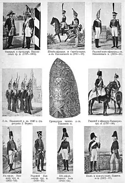 À l’époque des guerres napoléoniennes, les cheveux des grenadiers de la Garde du régiment Pavlovski étaient liés au bas de la nuque par un ruban noir et cachés par le col de la vareuse de couleur verte. Ils se distinguaient par le port de la moustache et des rouflaquettes[3]. En hommage à Paul Ier de Russie, les hommes du rang formant le régiment de la Garde Pavlovski avaient un nez court et aplati comme l’empereur[10].