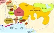 Au cours des années 1810 sont fondées à Maroua, à Garoua, respectivement dans les actuelles régions Extrême-Nord et Nord, et à Ngaoundéré des lamidats, qui sont comme des commanderies. À Ngaoundéré, pour alimenter les caisses de l'État qu'administre dans les faits le frère d'Ousmane dan Fodio, Abdullahi dan Fodio, l'émir Zodi se voit imposer par Adama un tribut annuel de cinq mille esclaves[11] que complète un important trafic d'ivoire. Par villages, la population émigre jusque dans les forêts de Centrafrique[12] et du Gabon, provoquant un mouvement de défrichage qui se prolonge pendant plus d'un siècle[12].