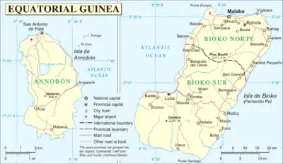 Elle est peuplée d'environ 265 000 habitants pour une superficie de 2 052 km², se composant de deux îles majeures qui sont aussi deux provinces : ladite Bioko et Annobón plus au sud (carte voisine), les deux étant séparées par l'État archipel indépendant de Sao-Tomé-et-Principe, outre le golfe de Guinée qui les baigne toutes, dans l'océan Atlantique.