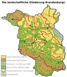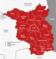 La région compte cinq villes-arrondissements (Kreisfreie Städte) : Berlin, Potsdam, Francfort-sur-l'Oder, Cottbus et Brandebourg-sur-la-Havel ; ainsi que quatorze arrondissements (Landkreis).