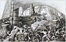 - l'équipage proprement dit, formé d'esclaves chrétiens, rassemblés en puisant parmi les quelque 1 000 ou 1 500 captifs chrétiens qu'hébergeait Salé en permanence[29]. Ce sont eux en particulier qui composaient la chiourme, que l'on enchaînait avant chaque combat « avec de grandes barres de fer » et des menottes[33] ;