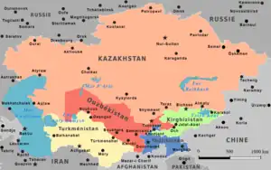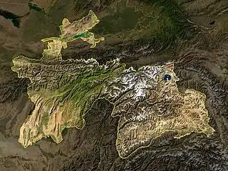 Le Tadjikistan (en tadjik : Тоҷикистон / Tojikiston et en russe : Таджикистан / Tadjikistan), en forme longue la république du Tadjikistan (en tadjik : Ҷумҳурии Тоҷикистон / Jumhurii Tojikiston et en russe : Республика Таджикистан / Riespoublika Tadjikistan), est un pays montagneux d'Asie centrale, sans accès à la mer. Sa capitale est Douchanbé. Il est limitrophe du Kirghizistan au nord-nord-est, de la Chine à l'est, de l'Afghanistan au sud-sud-ouest et de l'Ouzbékistan à l'ouest. C'est le seul État issu de l'ancienne Asie centrale soviétique où la langue dominante n'est pas une langue turcique mais iranienne, le tadjik[7],[8]. Les Tadjiks, qui forment le groupe ethnique majoritaire (84 % de la population[1]), appartiennent à la famille des peuples iraniens.