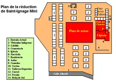 Dans une mission, les bâtiments principaux, comme l’église, le cimetière et l’école sont disposés d'un côté d’une large place, entourée de maisons sur les trois autres côtés. Au centre de celle-ci, se trouve une grande croix et une statue du saint patron de la mission. Les rues, les maisons, tout est ordonné selon des lignes géométriques précises, en conformité avec les recommandations espagnoles concernant la construction de nouvelles agglomérations. La position centrale de leur lieu d'habitation permet aux pères d'avoir constamment un regard sur toute la vie de la réduction.
