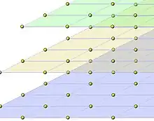 Trois géométries différentes de réseau présentent une symétrie cubique, illustrées dans la figure 15 ci-dessous. La première, correspondant à l'image de droite, est isomorphe au réseau ℤ3, c'est-à-dire qu'il existe une rotation et une homothétie qui envoie le réseau sur ℤ3. On parle, en cristallographie de réseau cubique primitif. Il existe un domaine fondamental cubique, globalement invariant par toute isométrie du groupe orthogonal. Le deuxième cas est illustré au centre de la figure 15. Il possède comme figure caractéristique, en vert, un cube dont les centres des faces sont occupés par un point. On parle de réseau cubique à faces centrées. Le domaine fondamental illustré n'est plus cubique. Le troisième cas est illustré dans l'image de gauche de la figure 15. Une figure répétitive apparaissant dans le réseau est celui d'un cube dont le centre est aussi élément du réseau, les cristallographes parlent de réseau cubique centré.