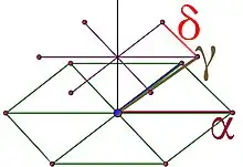La figure 17 illustre un réseau contenant un groupe orthogonal plus petit. Le réseau est obtenu par l'adjonction de 6 points supplémentaires à partir de la figure 16. Si δ désigne le plus petit vecteur du réseau orthogonal au plan de l'hexagone, 3 points se trouvent à une hauteur de δ/3 et les trois autres à 2δ/3. Les 3 points à une hauteur de δ/3 forment un triangle équilatéral de même géométrie que ceux qui constituent l'hexagone. Le centre de gravité de ce triangle est à la verticale du centre d'un hexagone et la projection parallèlement à δ, de chaque point du triangle correspond au centre de gravité d'un des triangles de l'hexagone. Les trois derniers points forment un autre triangle, obtenu par rotation d'axe dirigé par δ et d'un demi tour.