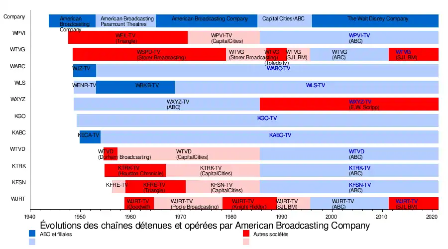 Le réseau est créé le comme un réseau radiophonique, successeur de NBC Blue racheté par Edward Noble, puis s'étend à télévision à partir de 1948. Au milieu des années 1950, le groupe fusionne avec United Paramount Theatres, l'ancienne division d'exploitation de salles de cinéma de Paramount Pictures dirigée par Leonard Goldenson. Ce dernier parvient à rendre la chaîne de télévision rentable avec de nombreuses séries télévisées à succès. Dans les années 1970, après avoir revendu ses salles de cinéma, ABC fusionne avec le groupe de presse Capital Cities. Au début des années 1980, la société ABC prend le contrôle de la nouvelle chaîne sportive ESPN avec 80 % du capital. Depuis 1996, la chaîne ABC fait partie du Disney-ABC Television Group, une division de la Walt Disney Company. En 2001, Disney rachète à la Fox une chaîne de télévision par câble spécialisée dans la rediffusion de séries et la renomme ABC Family (rebaptisée Freeform en 2016).