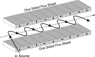 La disposition montrée ci-dessus est généralement dénommée "Halbach wiggler". Les vecteurs de magnétisation dans les plaques magnétisées tournent chacun dans une direction opposée; ci-dessus, le vecteur magnétique de la plaque supérieure tourne dans le sens des aiguilles d'une montre et le vecteur de magnétisation de la plaque inférieure tourne dans le sens trigonométrique. Cette conception est choisie pour que les composants x du champ magnétique des plaques s'annulent et que les composants y se renforcent et la valeur du champ est donnée par