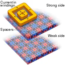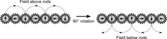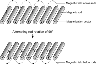 Cette disposition permet en pratique au champ d'être allumé ou éteint dessus ou dessous le plan des barres suivant le rotation de celles-ci. Un tel dispositif est un système mécanique permettant de faire varier un champ sans avoir besoin de puissance électrique. Une étude détaillée de cette disposition a montré que chaque barre était soumise a un fort couple de la part des barres voisines et qu'un blocage mécanique était requis[13]. Une solution simple et efficace est d'installer des engrenages sur chaque barre de façon à obtenir une rotation alternative comme montré sur le schéma.