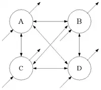 Ce modèle de réseau est constitué de N neurones à états binaires (-1, 1 ou 0, 1 suivant les versions) tous interconnectés. L'entrée totale d'un neurone i est donc :