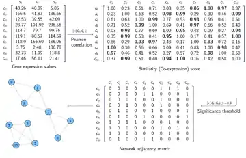 Les données d'entrée pour la construction d'un réseau de co-expression de gènes sont souvent représentées par une matrice. Si nous avons les valeurs d'expression génique de m gènes pour n échantillons (conditions), les données d'entrée seraient une matrice m × n, appelée matrice d'expression. Par exemple, dans une expérience de microréseau, les valeurs d'expression de milliers de gènes sont mesurées pour plusieurs échantillons. Dans la première étape, un score de similarité (mesure de co-expression) est calculé pour chaque paire de lignes dans la matrice d'expression. La matrice résultante serait une matrice m × m, appelée matrice de similarité. Chaque élément de cette matrice montre à quel point le niveau d'expression de deux gènes est similaire. Dans la deuxième étape, les éléments de la matrice de similarité qui dépassent un certain seuil (c.-à-d. des co-expressions significatives) sont remplacés par 1 et les éléments restants sont remplacés par 0. La matrice résultante, appelée matrice adjacente, représente le graphe du réseau. Dans cette matrice, chaque élément montre si deux gènes sont connectés dans le réseau (les éléments 1) ou non (les éléments 0).