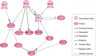 Les nœuds de ce réseau peuvent représenter des gènes, des protéines, des ARNm, des complexes protéine/protéine ou des processus cellulaires. Les nœuds représentés comme étant situés le long de lignes verticales sont associés aux interfaces cellule/environnement, tandis que les autres sont flottants et peuvent diffuser. Les bords entre les nœuds représentent des interactions entre les nœuds, qui peuvent correspondre à des réactions moléculaires individuelles entre l'ADN, l'ARNm, le miARN, les protéines ou les processus moléculaires par lesquels les produits d'un gène affectent ceux d'un autre, bien que le manque d'informations obtenues expérimentalement implique souvent que certains les réactions ne sont pas modélisées à un niveau de détail aussi fin. Ces interactions peuvent être inductives (généralement représentées par des pointes de flèches ou le signe +), avec une augmentation de la concentration de l'une entraînant une augmentation de l'autre, inhibitrices (représentées par des cercles pleins, des flèches mousses ou le signe moins), avec une augmentation dans l'un conduisant à une diminution de l'autre, ou double, lorsque selon les circonstances le régulateur peut activer ou inhiber le nœud cible. Les nœuds peuvent se réguler directement ou indirectement, créant des boucles de rétroaction, qui forment des chaînes cycliques de dépendances dans le réseau topologique. La structure du réseau est une abstraction de la dynamique moléculaire ou chimique du système, décrivant les multiples façons dont une substance affecte toutes les autres auxquelles elle est connectée. En pratique, de tels RRG sont déduits de la littérature biologique sur un système donné et représentent une distillation des connaissances collectives sur un ensemble de réactions biochimiques connexes. Pour accélérer la conservation manuelle des RRG, certains efforts récents tentent d'utiliser l'exploration de texte, les bases de données organisées, l'inférence de réseau à partir de données massives, la vérification de modèles et d'autres technologies d'extraction d'informations à cette fin[4].