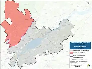 La Réserve mondiale de la Biosphère du lac Saint-Pierre (RMBLSP) s’étend sur une superficie de 7 394 km² et est répartie dans quatre régions administratives du Québec, soit la région de Lanaudière, de la Mauricie, du Centre-du-Québec et de la Montérégie. Dans celles-ci, on y retrouve un total de six municipalités régionales de comté (en incluant la Ville de Trois-Rivières), ce qui inclut 73 municipalités ainsi que deux communautés W8banakiak (Odanak et Wôlinak).
