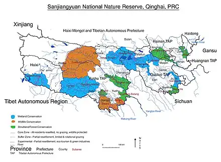 Fin 2004, le gouvernement central a engagé un plan de protection et la restauration écologique de la réserve des Sources des trois fleuves, qui doivent marquer le début de la restauration des zones humides du centre du plateau du Tibet-Qinghai.