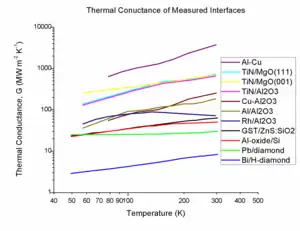 Cette quantité est d'importance majeure en microélectronique où l'on atteint des densités de flux de l'ordre de 103 MW/m2 nécessitant des conductances d'interface supérieures à 102 MW/m2/K pour pouvoir assurer un refroidissement efficace[5].