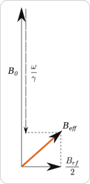 Lorsqu'un champ magnétique est appliqué, les moments magnétiques se mettent à tourner autour du champ magnétique, mais comme il n'y a aucun changement d'orientation lié à leur interaction avec le champ externe (section La précession de Larmor), il ne se passe rien de nouveau. En d'autres termes, le phénomène RMN ne devrait donc pas pouvoir être observé dans ces conditions (M. H. Levitt 2008, p. 31).