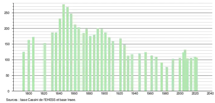 L'évolution du nombre d'habitants est connue à travers les recensements de la population effectués dans la commune depuis 1793. Pour les communes de moins de 10 000 habitants, une enquête de recensement portant sur toute la population est réalisée tous les cinq ans, les populations légales des années intermédiaires étant quant à elles estimées par interpolation ou extrapolation[18]. Pour la commune, le premier recensement exhaustif entrant dans le cadre du nouveau dispositif a été réalisé en 2004[19].