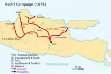 En , les forces alliées de la VOC et de Mataram marchent sur la capitale de Trunajaya, Kediri. Les troupes empruntent trois chemins distincts, sur suggestion du roi, afin de couvrir plus de territoire et d'intimider les factions autochtones n'ayant pas encore décidé de leur allégeance[36]. Cette stratégie est couronnée de succès, et durant la campagne, des bandes armées locales se joignent aux troupes coalisées, attirées par le butin[20]. Kediri est prise le par une force d'assaut dirigée par le capitaine François Tack (en)[20],[32]. Les alliés poursuivent jusqu'à Surabaya, la plus grande ville de l'est javanais, où Amangkurat établit sa cour[37]. Ailleurs, les rebelles sont également défaits. En , une force conjointe formée de troupes de la VOC, de Javanais et de Bugis sous les commandement de Sindu Reja et Jan Albert Sloot battent raden Kajoran dans une bataille à Mlambang près de Pajang[7],[38]. Malgré sa reddition, Sloot ordonne l'exécution de Kajoran[38]. En novembre, la VOC et ses alliés Bugis sous le commandement d'Arung Palakka expulsent les rebelles macassarois de leur forteresse à Keper (id) dans le Java oriental[7]. En , après ce que la VOC considère comme la bataille la plus acharnée de cette guerre, le seigneur rebelle de Giri est battu et une grande partie de sa famille est exécutée[7]. Cette série de victoires d'Amangkurat et de ses alliés de la VOC entraîne un nombre croissant de ralliement de Javanais au roi[7].