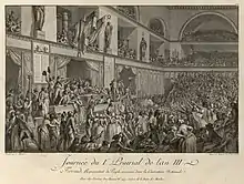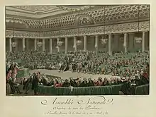 Le 17 juin 1789, le tiers et quelques députés de la noblesse et du clergé, sur proposition de Legrand et à l'invitation de Sieyès, prennent le titre d’« Assemblée nationale »[37]. Le 19 juin, le clergé, qui compte une minorité de curés sensibles aux problèmes des paysans, décide de se joindre aux députés du tiers état pour la vérification des pouvoirs. Le 20 juin, le roi fait fermer la salle des Menus Plaisirs, lieu de réunion du tiers état. Ceux-ci se dirigent alors vers une salle de Jeu de paume voisine.