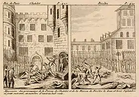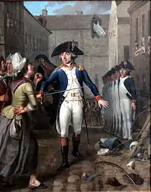 Face à la foule marchant sur la Bastille, son gouverneur, le marquis de Launay, accède à la demande de médiateurs venus de l'Hôtel de Ville et accepte par écrit la reddition de la forteresse sous la promesse qu'il ne sera fait aucun mal à la garnison. Il laisse la foule pénétrer dans la première cour. Il se ravise et fait tirer à la mitraille : il y a des morts. Des Gardes françaises mutinées amènent alors des canons pris aux Invalides : le gouverneur cède et abaisse les ponts-levis. Il est cinq heures de l'après-midi. Les Vainqueurs de la Bastille se dirigent ensuite vers l'Hôtel de Ville avec leurs prisonniers. Sur le chemin, Launay est massacré. Sa tête est découpée au canif[54]. Arrivés à l’Hôtel de Ville, les émeutiers accusent le prévôt des marchands Flesselles de trahison. Il est lui aussi lynché et sa tête promenée au bout d’une pique avec celle de Launay. Toute la journée, des barrières et des bâtiments fiscaux parisiens sont attaqués et incendiés.