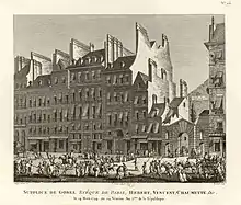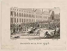 Le lendemain 17 juillet, la pétition est déposée au Champ-de-Mars, sur laquelle se rassemble une foule de 5 000 personnes[Note 9]. À la suite d’incidents, la loi martiale est décrétée par la municipalité, dirigée par Bailly. La Fayette fait tirer sur la foule. La fusillade du Champ-de-Mars[81] qui fera 50 morts crée une rupture durable entre les monarchistes constitutionnels et les autres révolutionnaires, démocrates[82], comme Danton, Marat ou Robespierre ou républicains comme Condorcet.