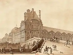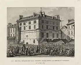 Or l'ensemble de la population parisienne est agitée : la bourgeoisie a peur pour la survie de l’Assemblée ; le peuple, lui, craint que les troupes ne coupent les routes du ravitaillement des Parisiens alors que le prix du pain est au plus haut. Début juillet, des émeutes éclatent aux barrières d’octroi. Le roi renvoie ses ministres jugés trop libéraux, parmi lesquels Necker, contrôleur des Finances, remercié le 11 juillet et invité à sortir du Royaume[45]. La nouvelle est connue à Paris le 12. Les Parisiens s'arment et manifestent. Dans l’après-midi, dans les jardins du Palais-Royal, le journaliste Camille Desmoulins exhorte la foule à se mettre en état de défense. Il considère le renvoi de Necker comme une attaque contre le peuple. Dans les jardins des Tuileries et aux Invalides, les Parisiens se heurtent au régiment dit du Royal-Allemand du prince de Lambesc dont les soldats sont accusés d'avoir tué des manifestants[46].