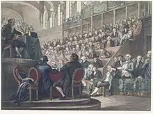 Lors de la séance royale du 23 juin 1789, Louis XVI, jusqu'alors silencieux[38], définit un programme de travail, proposant aux députés de réfléchir aux réformes concrètes dont il esquisse l'économie et ordonne aux députés de siéger en chambres séparées. Alors que les députés de la noblesse et du haut clergé obéissent, les députés du tiers état et ceux du bas clergé restent immobiles. Bailly, élu président en tant que doyen, répond au marquis de Dreux-Brézé leur sommant de se retirer que la « Nation assemblée n'a d'ordre à recevoir de personne » et Mirabeau l'apostrophe en affirmant que seule la force pourrait les faire quitter les lieux[39]. Face à cette résistance, le roi invite le 27 juin les trois ordres à débattre ensemble[40].
