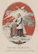 La Constitution civile du clergé, adoptée le 12 juillet 1790 et ratifiée par le roi le 24 août 1790[60], transforme les membres du clergé en fonctionnaires salariés par l’État. Les membres du clergé séculier sont désormais élus et doivent prêter un serment dans lequel ils s'engagent à accepter et protéger la nouvelle organisation du clergé[Note 7]. Suivant une tradition gallicane et janséniste bien ancrée dans une partie de la bourgeoisie parlementaire, en accord avec une partie de l'héritage des Lumières favorable à la laïcisation de la société, les députés n'ont pas demandé au pape son avis sur les réformes du clergé catholique. Les premiers clercs commencent à prêter serment sans attendre l'avis du souverain pontife.