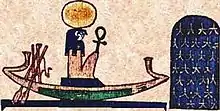 Rê (ou Râ) est un dieu solaire dans la mythologie égyptienne, créateur de l'univers. Il peut apparaître sous plusieurs autres formes, celle de Khépri, le scarabée bousier : symbolisant la naissance ou la renaissance ou encore Atoum, l'être achevé (le clergé égyptien expliquait que l'astre solaire pouvait revêtir des formes différentes lors de sa course dans le ciel : Khépri était le soleil levant tandis que Rê était le soleil à son zénith et Atoum, le soleil couchant)[2],[3]. Au fil du temps, Atoum (le soleil couchant) est assimilé progressivement par les théologiens égyptiens à la forme de Rê (le soleil à son zénith), de sorte que l'on parle de Rê-Atoum, le dieu créateur, qui préside la Grande Ennéade constituée des neuf dieux principaux. Par la suite, Rê a également été associé à plusieurs autres dieux comme Amon pour devenir Amon-Rê.