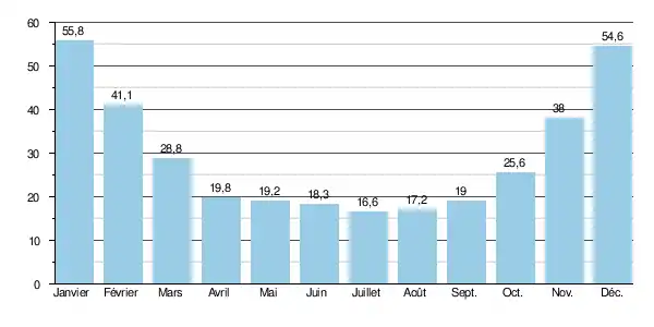 Le débit moyen mensuel observé en juillet (minimum d'étiage) est de 16,6 m3/s, soit plus du quart du débit moyen du mois de janvier (55,8 m3/s), ce qui témoigne de l'amplitude assez modérée des variations saisonnières. Sur la durée d'observation de 4 ans, le débit mensuel minimal a été de 14,7 m3/s, tandis que le débit mensuel maximal s'élevait à 64,5 m3/s.
